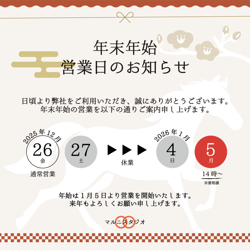 年末年始の営業に関しまして<2025→2026> 2025 11/05 information 2025年11月5日 information よかったらシェアしてね! URLをコピーしました! URLをコピーしました! 新年のご挨拶